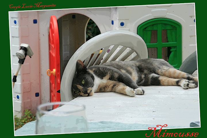 Tu dois prendre Mimousse bien souvent en photo pour qu'elle est un tel comportement! Je l'inclue dans le genre féminin? C'est sa maison derriére? Un bien joli cadre avec tous ces plastiques en couleur!